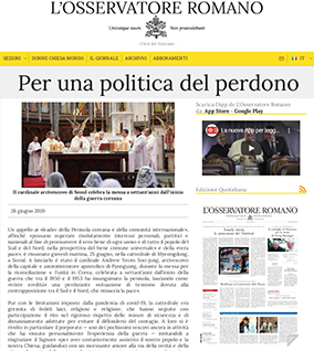 염 추기경과 ‘한반도 평화 기원 미사’ 크게 보도 교황청 기관지 ‘로세르바토레 로마노’가 서울대교구장 염수정 추기경이 6월 25일 주교좌명동대성당에서 ... | 세계교회