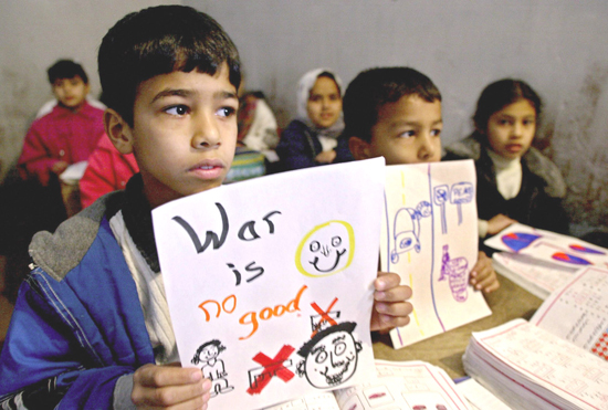 ▲ 이라크 학생이 12월 31일 바그다드에 있는 한 학교에서 전쟁 반대라고 쓴 글을 들고 있다.