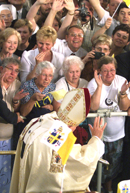 ▲ 교황 요한 바오로 2세가 8월 17일 폴란드 크라코프 근교 라지에프니키에 세워진 하느님의 자비 대성전에 도착해 신자들로부터 환영을 받고 있다.