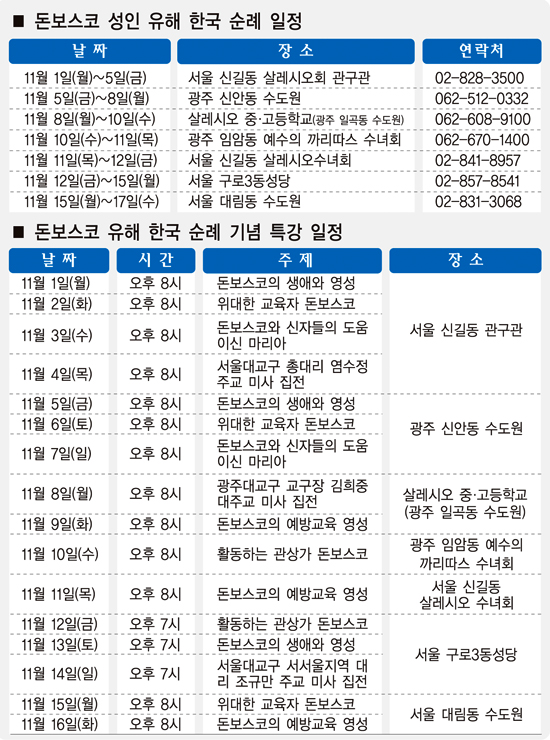아울러 살레시오회는 성인의 유해가 순례를 하는 동안 돈보스코 성인의 생애와 영성을 되돌아보는 기념특강을 실시한다. 특강은 11월 1~16일 국내 각 순례지에서 매일 다른 주제로 진행된다. 특강기간 중에는 서울대교구 총대리 염수정 주교(11월 4일)와 광주대교구장 김희중 대주교(11월 8일), 서울대교구 서서울 지역 교구장 대리 조규만 주교(11월 14일) 주례로 미사도 봉헌된다.