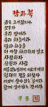 함경북도 경성 출신으로 실향민인 그는 작품에 간절한 통일에 대한 염원을 담았다. 여기에 자신의 시와 성경구절, 만해 한용운 등의 글귀도 포함돼 있다.