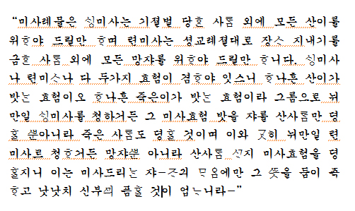 위의 문헌에서 우리는 교훈을 얻을 수 있다. 생미사와 연미사의 획일적 구분에 대해 그리고 미사지향을 너무 상세히 적어 발표하는 것에 대해서 한국 천주교회는 전통적으로 올바른 지침을 내렸다는 것이다.