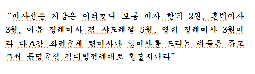 또한 「회장직분」에는 고해성사 중에 미사지향을 부탁하거나 예물을 드리는 것을 금지한다고 나와 있다. 당시에는 미사예물이 공식적으로 나와 있는데
