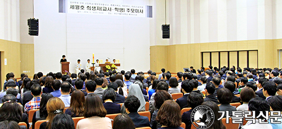 ▲ 부산교구 학교법인 성모학원 산하 고등학교들이 14일 부산가톨릭대 베리타스관에서 추모미사를 봉헌하고 있다.
