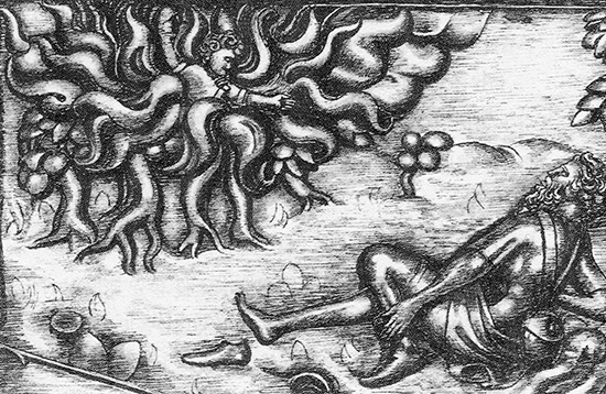 ▲ 「성경인물 50」 중 삽화. 모세가 불타는 떨기나무 앞에서 자신의 지팡이를 내려놓은 채 신을 벗고 있다.(탈출 3,5-6) 파리 성 엘리사벳 성당의 나무 벽화.