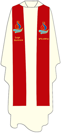 주교들이 착용할 제의는 금색실로 수놓은 십자가 위에 교황 방한 기념 로고를 단순화시켜 새긴 것이 특징이다. 금색 십자가는 고통의 십자가가 아닌 영광과 찬미의 의미를 담고 있다. 가로, 세로 세 줄로 춤추는 듯한 곡선으로 형상화된 십자가는 한국적인 아름다움을 보여준다. 영대는 시복식에 참여하는 사제들에게 흰색 제의와 함께 제공된다. 영대 양쪽에는 교황 방한 기념 로고가 새겨져 있다. 로고 아래에는 금색실로 교황 방한 주제어인 ‘일어나 비추어라’를 한국어와 라틴어로 수놓았다.