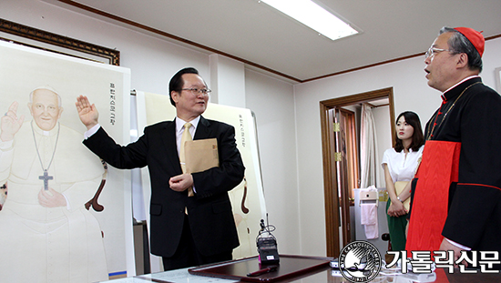 염수정 추기경은 11일 오전 교구청 1층 소회의실에서 한국 문화부 전통초상화가 양성과정 원생들의 예방을 받고, 그들이 제작한 프란치스코 교황 초상화 2점과 흉상을 전달받았다.