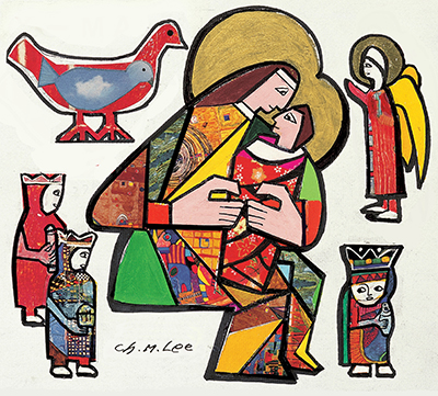 이춘만(크리스티나) 화백의 콜라주 작품 ‘모두 와서 경배하세(Venite Adoremus)’는 ‘상징언어’로 표현된다. 찬미찬송을 상징하는 천사, 성령을 상징하는 비둘기는 하느님의 평화와 예언을 나타내는데, 그리스도가 우리를 이끌고 보호하는 역할을 한다는 것을 드러낸다. 작가는 모든 능력을 표시하려는 의도로 성령을 대단히 중요하게 표현한다. 이 작품의 중심은 물론 성모와 예수다. 하느님께 순종하는 우리 신앙의 대표적 상징인 성모와 사랑의 상징인 아기예수다. 작가는 의도적으로 성모와 아기예수의 빛을 하트모양으로 묘사해 지상의 사랑을 직접적으로 표현했다. 성모와 아기예수의 화려한 색채 의상은 좀 더 아름답게 묘사하고 싶은 작가의 사랑과 경배의 반영이다. 반면, 황금과 유약과 몰약을 갖고 방문한 동방박사는 좀 더 작게 표현해 성모와 우리에게 오신 아기예수의 상징을 부각시킨다. 작가의 작품에서 일관되게 드러나는 기호 중 하나인 큰 손은 오늘, 나눔, 창조의 상징이며, 빈손은 무소유, 평화의 상징인데 이 작품에서도 그만의 특징이 잘 나타나 있다.