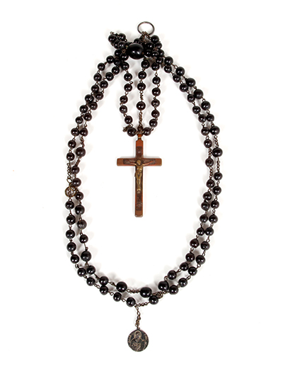 옛 수도복에서 볼 수 있는 것이 또 하나 있다. 수녀들은 수도복 허리에 검은 묵주 10단을 걸고 다녔다. 첫 서원자는 구리 십자가가 달린 5단 묵주를 허리에 걸고 다녔고 종신 서원자는 묵주알 십자가가 달린 묵주 5단을 더 첨가했다. 그러나 예수 그리스도의 십자가 무게와 어찌 비교할 수 있을까! 검고 굵은 묵주 알이 수녀들이 걸을 때 사각사각 소리를 내어 지나가는 행인들이 듣고 수녀들의 존재를 의식하곤 했다. 당시에 이 묵주는 수녀들이 손수 만들었는데 만들기가 여간 어려운 것이 아니었다고 한다. 굵은 구리줄을 비틀어 고리를 만들고 묵주 알을 연결하느라 손끝이 부르트고 상처를 남기기도 했다. 모든 것을 수작업으로 해야 했던 시절이지만 한 알 한 알 엮으며 수녀들은 기도 속에 수많은 영혼들을 하느님께 의탁한 유물이기도 하다.
