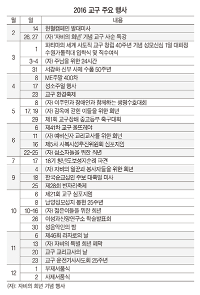 새해의 키워드는 바로 ‘자비’다. 2016년 교구장 사목교서의 주제도 ‘하느님 자비의 얼굴인 그리스도의 증인’이다. 교구의 주요 사목방향은 사목교서에 따라 ‘자비’에 초점을 맞추고 있다. 교구는 하느님 자비를 체험하도록 유도하는 다양한 사목 프로그램을 운영하게 된다.