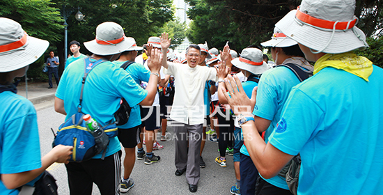 ▲ 2015년 7월 열린 청년도보성지순례. 이성효 주교가 완주자들을 환영하며 인사를 나누고 있다.