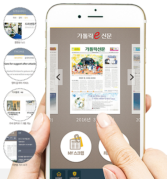 ‘가톨릭e신문’의 주요 역할은 매주 발행되는 가톨릭신문 지면 PDF 서비스다. 스마트폰에서 확대 축소해도 최상의 화질로 지면 보기가 제공된다. e신문의 특징을 구체적으로 보면, 각 기사별 지면 이미지와 함께 기사 텍스트 보기를 서비스한다. 페이스북, 트위터와 같은 SNS를 통한 기사 공유도 할 수 있다. 또 스크랩 기능으로 원하는 기사는 개별 폴더에 저장해 찾을 수 있다.