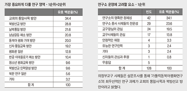 사제들은 연구소의 우선적 연구 영역을 ‘교회의 통일사목 방안’(34.4%)이라고 보았다. 이어 ‘북방선교 방안’(28.8%), ‘남북통일 방안’(21.6%), ‘남남갈등 해소 방안’(20.8%)의 순으로 제시했다. 전체적으로 교회 안팎의 과제들이 각각 절반을 차지, 가톨릭의 정체성을 유지하면서도 사회 전체의 흐름에 일치해야 한다는 제안인 것으로 분석된다.