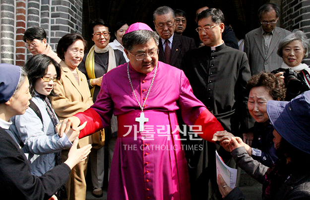 조규만 주교가 4월 28일 서울 명동주교좌성당에서 감사미사를 봉헌한 후 신자들과 석별의 정을 나누고 있다. 사진 서상덕 기자