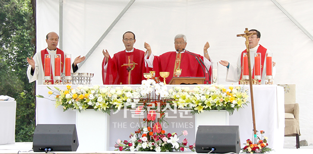대전교구장 유흥식 주교(오른쪽 두 번째)가 5월 26일 진산성지에서 봉헌된 ‘복자 윤지충 바오로와 동료 123위’ 기념일 미사를 주례하고 있다.