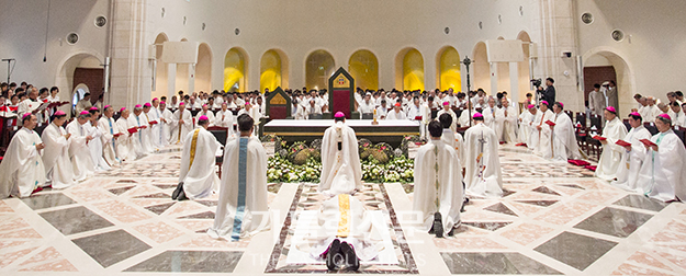 대구대교구 장신호 주교가 7월 12일 주교좌 범어대성당에서 거행된 주교서품식 중 성인 호칭 기도가 봉헌되는 가운데 엎드려 있다. 사진 박원희 기자