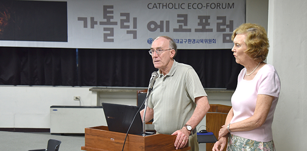 7월 15일 서울 명동 가톨릭회관에서 열린 가톨릭 에코포럼에서 미국 예일대 교수 존 그림-메리 에블린 터커씨 부부가 강연하고 있다. 서울대교구 환경사목위원회 제공