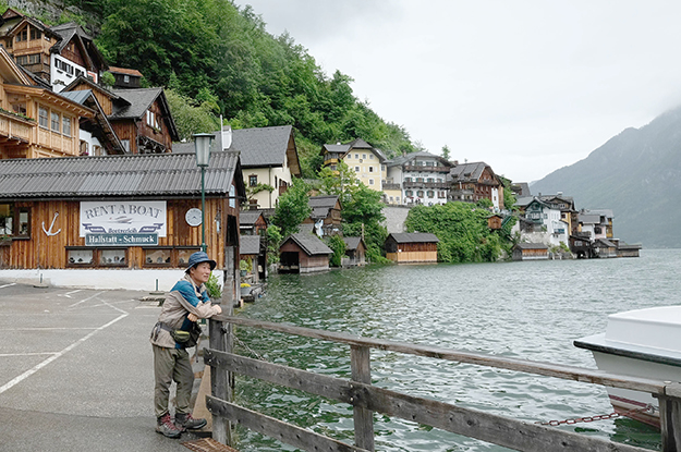 이화재씨가 동유럽 ‘야고보의 길’ 도보순례 중 오스트리아 할슈타트 호수를 바라보고 있다. 이화재씨 제공