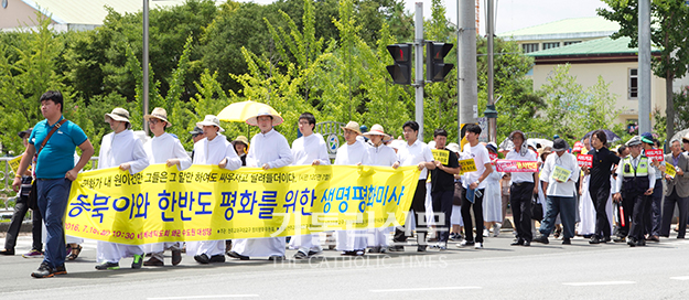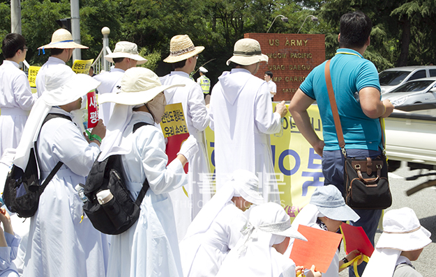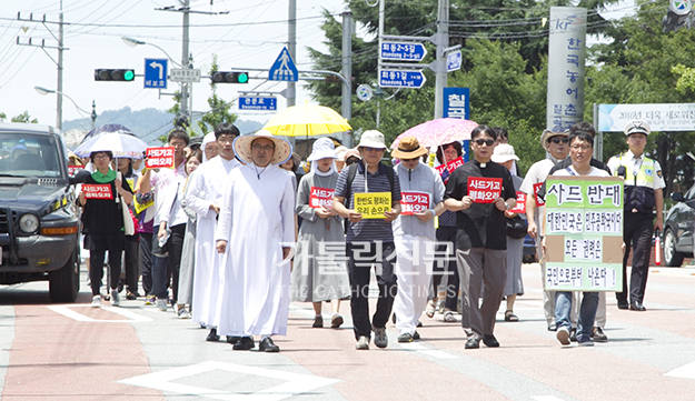 미사 후 참가자들은 미군 부대 캠프 캐롤 정문까지 ‘사드 배치 철회’를 지향으로 묵주기도를 하며 걸었다. 폭염 속에서 묵묵히 기도하며 간절한 마음을 모았다.