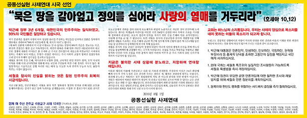 수원교구 공동선실현 사제연대(대표 김형중 신부, 이하 사제연대)가 8월 1일 시국선언을 통해, 민주주의의 회복을 부르짖고 세월호 특별법 개정과 사드배치 결정 철회 등을 촉구했다.