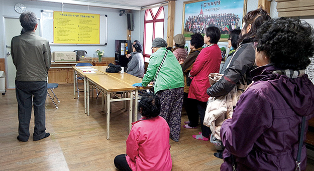 기계본당 신자들이 지난 4월 11일 기계5일장에서 가두선교를 마치고 성당으로 돌아와 새 성전 봉헌 기도문을 바치고 있다. 대구대교구 포항 기계본당 제공