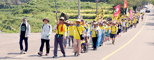 이들은 동진(200여 명)과 서진(300여 명)으로 나눠 탑동광장까지 각각 88㎞, 107㎞를 완주했다. 섭씨 30도를 훨씬 웃도는 무더위가 엄습하고 폭우가 쏟아지는 가운데서도 제주도를 거의 반 바퀴 도는 여정을 이어갔다.