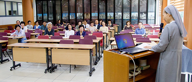 8월 17일 대구 도원본당 민족화해분과 설립 미사 후 이어진 위원 연수에서 대구 민화위 간사 장숙희 수녀가 강의하고 있다.