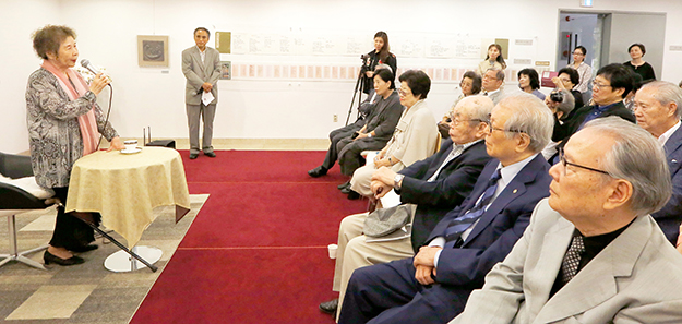 9월 23일 서울 평창동 영인문학관에서 열린 ‘시와 더불어 70년-김남조 자료전’ 개막식에서 김남조 시인(왼쪽)이 인사말을 하고 있다.