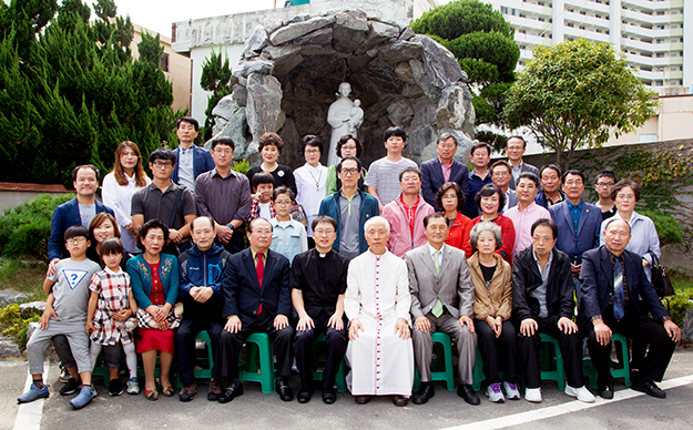 지난 달 마산 양덕동성당에서 모임을 가진 강남도씨(앞줄 오른쪽에서 네 번째)와 대자 가족들이 본당 주임 유영봉 몬시뇰(강씨 왼쪽)과 보좌 유청 신부(유 몬시뇰 왼쪽)와 함께 기념촬영하고 있다.