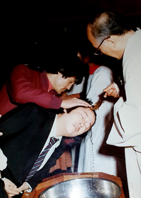 1980년대 초 양덕본당 사무장 시절 거행된 세례식에서 대부를 서고 있는 강남도씨. 강남도씨 제공