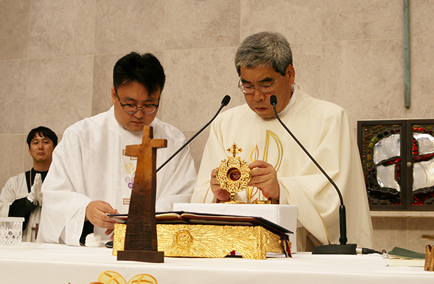 홍승모 몬시뇰(오른쪽)이 10월 8일 인천 소래포구성당에서 열린 성녀 마더 데레사 수녀 유해 봉안식에서 유해를 성광에 넣고 있다.