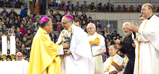 10월 30일 마산교구 설정 50주년 감사미사에서 교구장 배기현 주교(왼쪽)가 오스트리아 그라츠교구장 빌헬름 크라우트바쉘 주교로부터 성모자상 선물을 받고 있다.