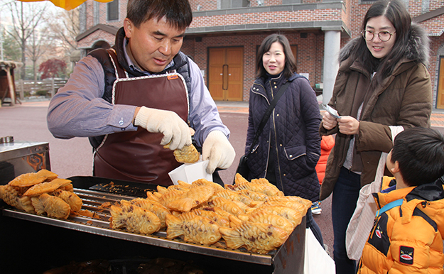 노원본당 대건회가 3년째 매년 11월 중순부터 2월말까지 여는 붕어빵 가게. 바로 옆에선 남성총구역에서 운영하는 어묵가게도 성황이다.
