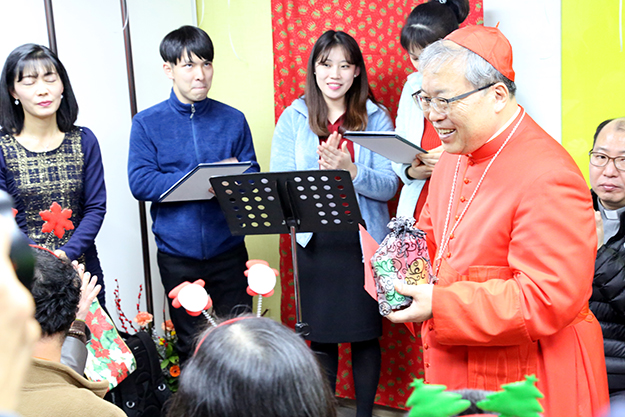 12월 23일 염수정 추기경이 성지보호작업장에서 성탄 미사를 봉헌한 뒤 작업장 장애인들로부터 초를 선물로 받고 있다.