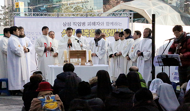 예수 성탄 대축일 오전 서울 서초동 삼성전자 홍보관 앞에서는 유경촌 주교(서울대교구 사회사목담당 교구장 대리) 주례로 ‘삼성 직업병 피해자와 함께하는 성탄 대축일 현장미사’가 봉헌됐다.