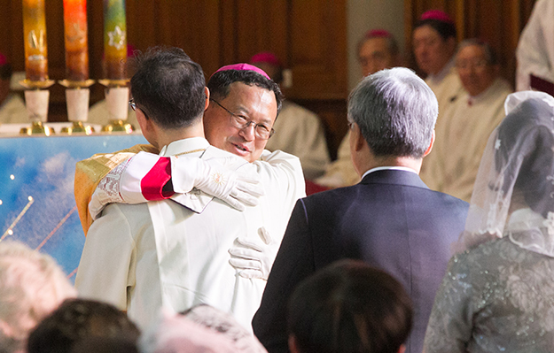 정신철 주교는 이날 착좌식에서 염 추기경과 파딜랴 대주교, 김 대주교가 공동으로 전해준 목장을 받아들고, ‘보아라 대사제’ 성가가 울려 퍼지는 가운데 주교좌에 앉았다. 이어 교구 사제단의 순명 서약을 받고, 평화의 인사를 나눴다.
