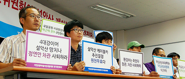 설악산 오색 케이블카 사업에 대해 종교계를 필두로 환경단체 등은 반대 입장을 분명히 밝혀왔다. 사진은 2015년 9월 1일 서울 명동 가톨릭회관에서 열린 자연공원케이블카반대범국민대책위원회 기자회견. 가톨릭신문 자료사진