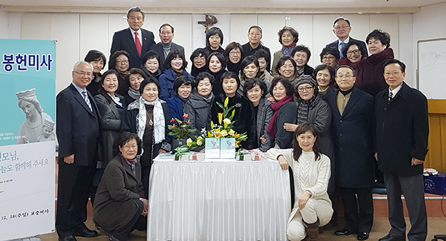 「성모님, 오늘도 함께해 주세요」 공동저자로 이름을 올린 서울 사당5동본당 신자들이 지난해 12월 18일 책 봉헌 미사 후 기념촬영을 하고 있다. 사당5동본당 제공