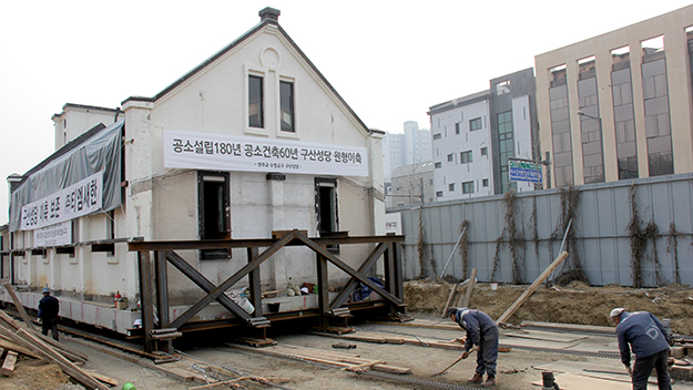 1월 18일 구산성당에서 원형보존 이전 작업이 진행 중이다.