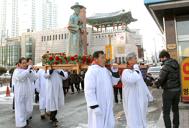 1월 22일 대구 비산본당 신자들이 이윤일 성인상을 메고 관덕정순교기념관에서 비산성당까지 성해 이동 길을 재현하고 있다.