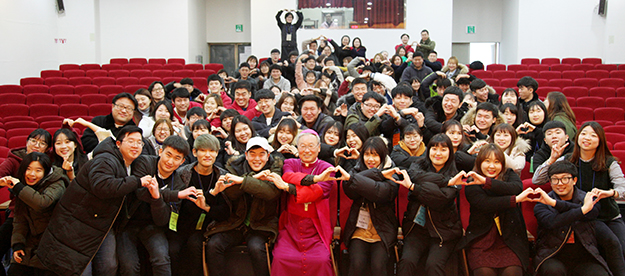 2월 12일 강원도 춘천시 강원도청소년수련관 3층 강당에서 열린 춘천교구 청년신앙학교 토크콘서트를 마치고 김운회 주교와 청년들이 기념사진을 찍고 있다.