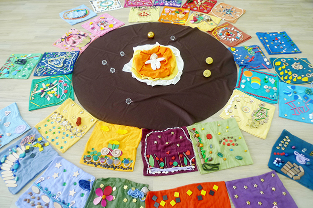 제시된 사진은 ‘탈렌트의 비유’ 이야기를 자료와 나눔을 통해 제시한 바닥그림이다. 각 사람은 다양한 색의 작은 천에 여러 가지 자료를 담아 놓은 보따리를 하나씩 받게 된다. 이는 하느님께서 우리 각자에게 고유하고도 특별한 탈렌트를 주셨음을 가시적으로 체험하게 한다는 의미를 지닌다. 실제적으로 참여자들은 받은 이 보따리를 풀어서 바라보고 내적으로 심화하면서 자신이 받은 고유한 탈렌트의 가치를 기억해볼 수 있다.