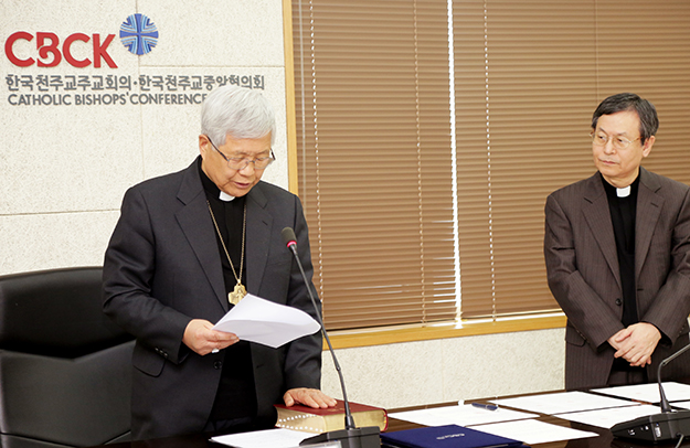주교회의 시복시성주교특별위원회 위원장 유흥식 주교(왼쪽)가 2월 22일 ‘이벽 요한 세례자와 동료 132위’ 시복 예비심사 법정에서, 성경에 손을 얹고 재판관으로서 책임과 의무를 다 할 것을 선서하고 있다.
