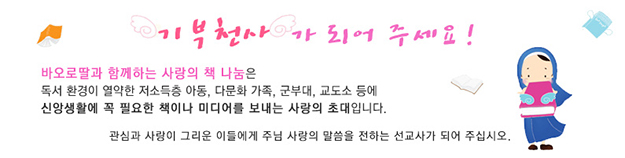 ‘사랑의 책 나눔’은 독서 환경이 열악한 저소득층 아동과 다문화 가족, 군부대 장병, 교도소 수용자 등에게 신앙생활에 꼭 필요한 책과 미디어를 보내는 캠페인이다. 기부는 바오로딸 홈페이지(www.pauline.or.kr)에서 각각의 책을 선택한 후, ‘기부하기’를 선택하면 쉽게 할 수 있다. 여러 가지 매체를 기부할 때는 ‘장바구니’에 담은 후 ‘기부하기’를 선택하면 된다. ‘기부하기’의 결제도 일반 주문과 동일하게 신용카드나 계좌이체, 무통장 입금 등으로 가능하다. 상품권과 마일리지 및 예치금도 사용할 수 있다. 금액 기부도 가능하다.