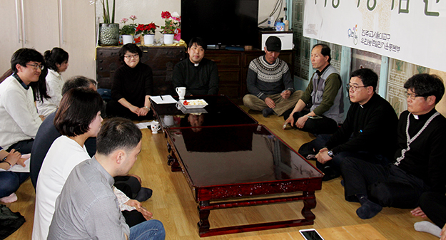 3월 10일 서울 우리농 본부장 백광진 신부(오른쪽에서 두 번째)와 관계자, 생산자들이 인천교구 조경호 농민 농장에서 기금을 전달한 뒤 간담회를 갖고 있다.
