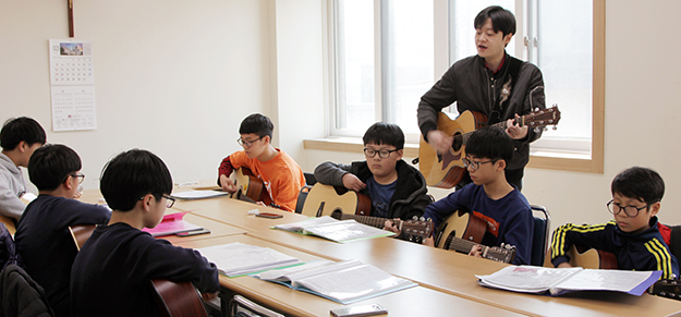 연희토요문화학교 어쿠스틱 기타 반에서 기타를 배우고 있는 학생들.