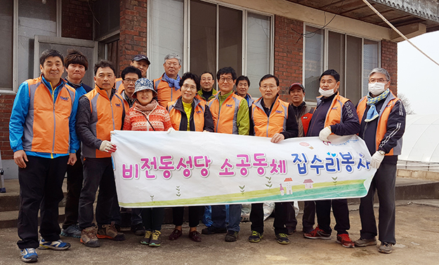 3월 25일 평택대리구 비전동성당 성모상 앞에서 기도를 바친 신자들이 재빨리 물건을 옮긴다. 도배지, 장판, 조명시설 등 각종 도구들을 차에 실었다. 이날은 비전동본당 집수리봉사단(단장 박석균, 주임 최재철 신부) 단원들이 봉사하러 가는 날이다.