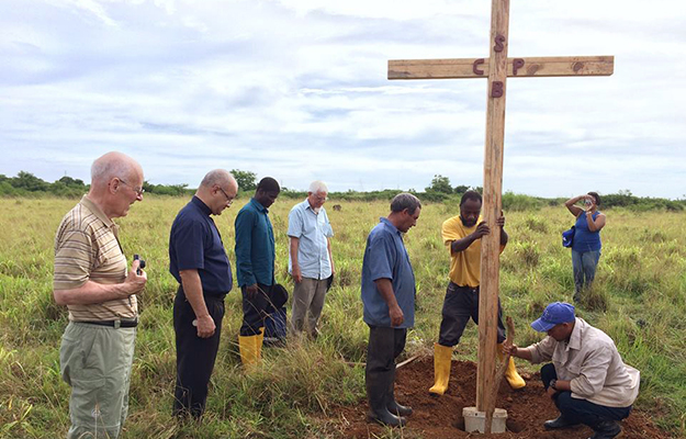 2014년 수도원 성당 신축 예정지에 십자가를 세우고 있는 성 베네딕도회 오딜리아연합회 아빠스들 성 베네딕도회 왜관수도원 제공