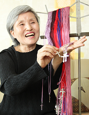 매듭묵주를 손수 만들어 국내외 성지에 봉헌하는 김명희씨는 “묵주를 가져간 이들과 함께 기도하고 있다고 믿는다”고 말했다.