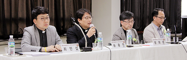 4월 29일 오후 서울 명동 가톨릭회관에서 열린 ‘제3천년기를 향한 가톨릭 신자들의 신앙감각과 사목적 비전’ 주제 새천년복음화연구소 심포지엄. 왼쪽부터 최민섭 신부, 송용민 신부, 정희완 신부, 황경훈 박사.